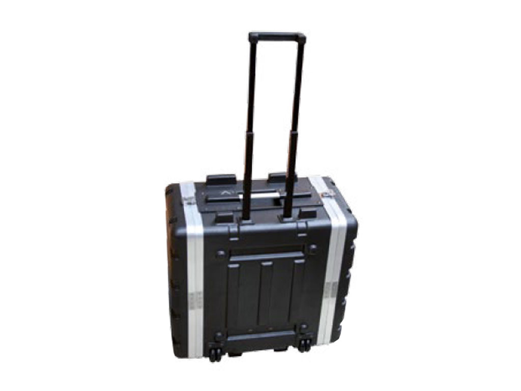 Flight case in ABS per 6 unità rack con trolley, maniglia anatomica, sportelli laterali estraibili.