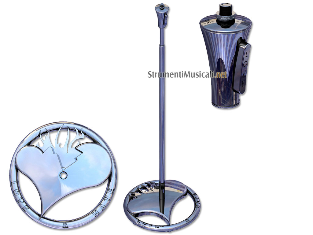 Asta microfonica professionale dritta Custom Series "Love Hate", caratterizzata da impugnatura e base con design ricercato, dotata di speciale meccanismo di regolazione azionabile con una sola mano, altezza regolabile da 1016 mm a 1626 mm, peso 4.5 kg, colore cromo.