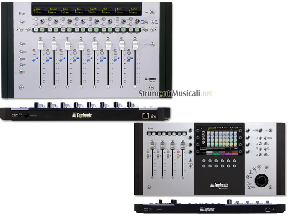MC Mix è la superficie di controllo professionale della "Artist Series" di Euphonix che integra otto fader motorizzati ed encoder rotativi 'touch sensitive' e 8 display canale ad alta risoluzione (128 x 64 pixels). Per la prima volta si ha la possibilità di lavorare in studio con un prodotto Euphonix che ha un costo veramente alla portata di tutti, ma senza nessun compromesso sulla qualità! MC Control e MC Mix si integrano con estrema facilità in qualsiasi studio, adattandosi alla perfezione tra la tastiera del computer e lo schermo, con la possibilità di collegare insieme fino a quattro unità per realizzare una più ampia superficie di controllo integrata. MC Control e MC Mix integrano il protocollo EuCon™ sviluppato da Euphonix per garantire il controllo simultaneo di molteplici applicazioni e workstation tramite cavo Ethernet ad una velocità di 250 volte superiore e ad una risoluzione otto volte superiore rispetto al protocollo MIDI. MC Control v2 ha lo stesso layout ergonomico e lo stesso design compatto della precedente versione, ma offre una grafica rinnovata e potenziata grazie ad un nuovo touch-screen retroilluminato a LED e gli otto nuovi encoder rotativi offrono un controllo tattile dei parametri ancora migliore. L'MC Control v2 sfrutta l'EuCon, un protocollo ad alta velocità sviluppato da Euphonix che consente di controllare contemporaneamente diverse applicazioni o addirittura diverse workstation via Ethernet ad una velocità 250 volte superiore a quella del protocollo MIDI e con una risoluzione otto volte superiore. L'EuCon rileva automaticamente l'applicazione che si trova in primo piano ed in un attimo aggancia al software tutti i controlli ed il display touch-screen ad alta risoluzione.