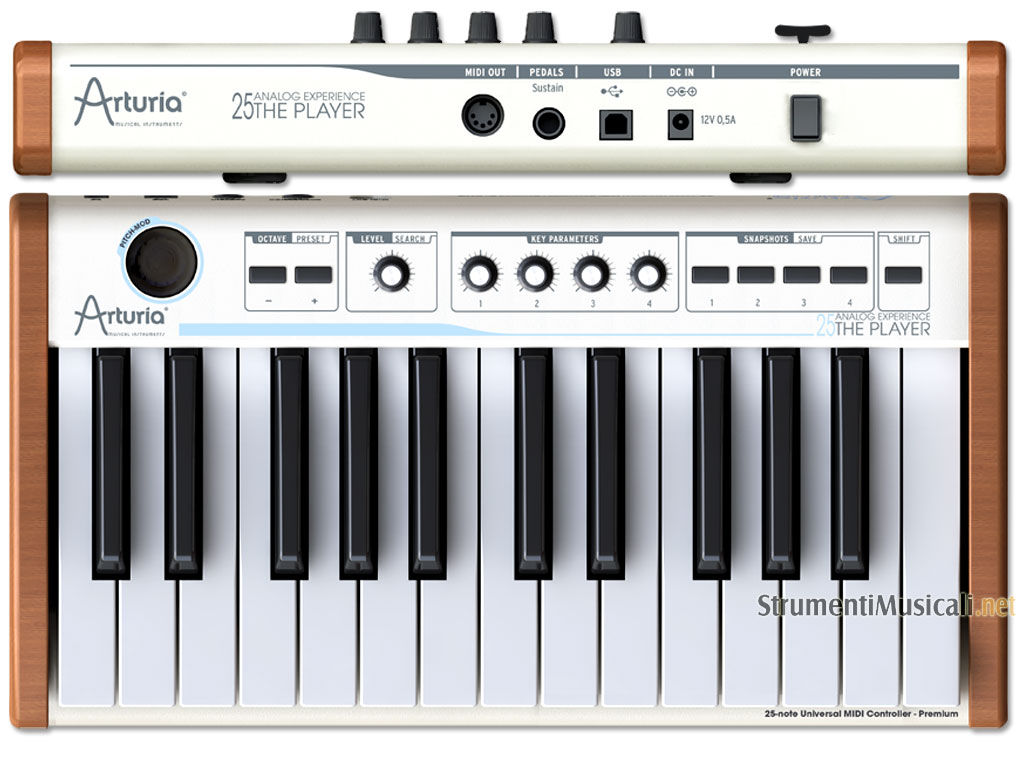The Player è costituito da un controller MIDI a tastiera compatto e una versione light del software Analog Factory: un bundle economico e semplice da utilizzare che vi offre il top dei suoni di synth Arturia e una tastiera dedicata di alta qualità che potete usare come controller MIDI universale con qualsiasi software. La tastiera ha tutta la qualità e la robustezza di un controller in legno e metallo, ed è l'ideale per chi ama fare musica "on the road". I 25 tasti sono sensibili alla velocity per offrirvi tutte le sfumature dinamiche di cui avete bisogno, ed il loro speciale profilo "da synth" farà felici gli amanti dei glissandi. Il software incluso in The Player offre circa 1000 suoni diversi che sfruttano tutta la qualità dei synth Arturia basati sul motore TAE: una versione light di Analog Factory pensata per coloro che non hanno voglia di perdersi nei meandri del sound design.