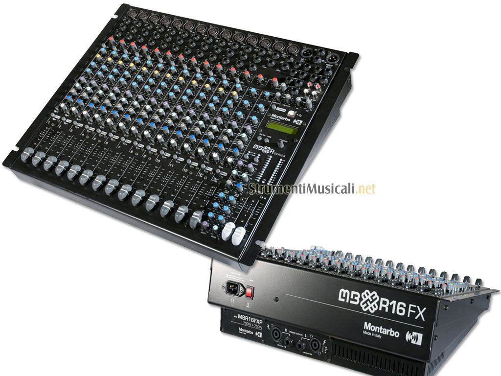 I mixer MB-R16FXP sono caratterizzati dalle ridottissime dimensioni, che ne consentono il montaggio in rack standard da 19" mediante gli adattatori opzionali, dalla completa dotazione di mandate e ritorni e dalla pratica configurazione dei comandi, che ne rende semplice ed immediato l'utilizzo. Sono dotati del doppio processore di effetti stereo Montarbo, basato su un potente DSP a 56 bit di ultima generazione che mette a disposizione 2 x 205 programmi, con una grande facilità di utilizzo ed una qualità sonora altissima grazie alla doppia conversione a 24 bit. I mixer MB-R12FXP incorporano un amplificatore a due canali in classe D da 750+750 W EIAJ. L'alimentazione switching permette di mantenere un peso ridottissimo, e l'altissima efficienza minimizza la generazione di calore, garantendo una elevatissima affidabilità e una lunga durata.