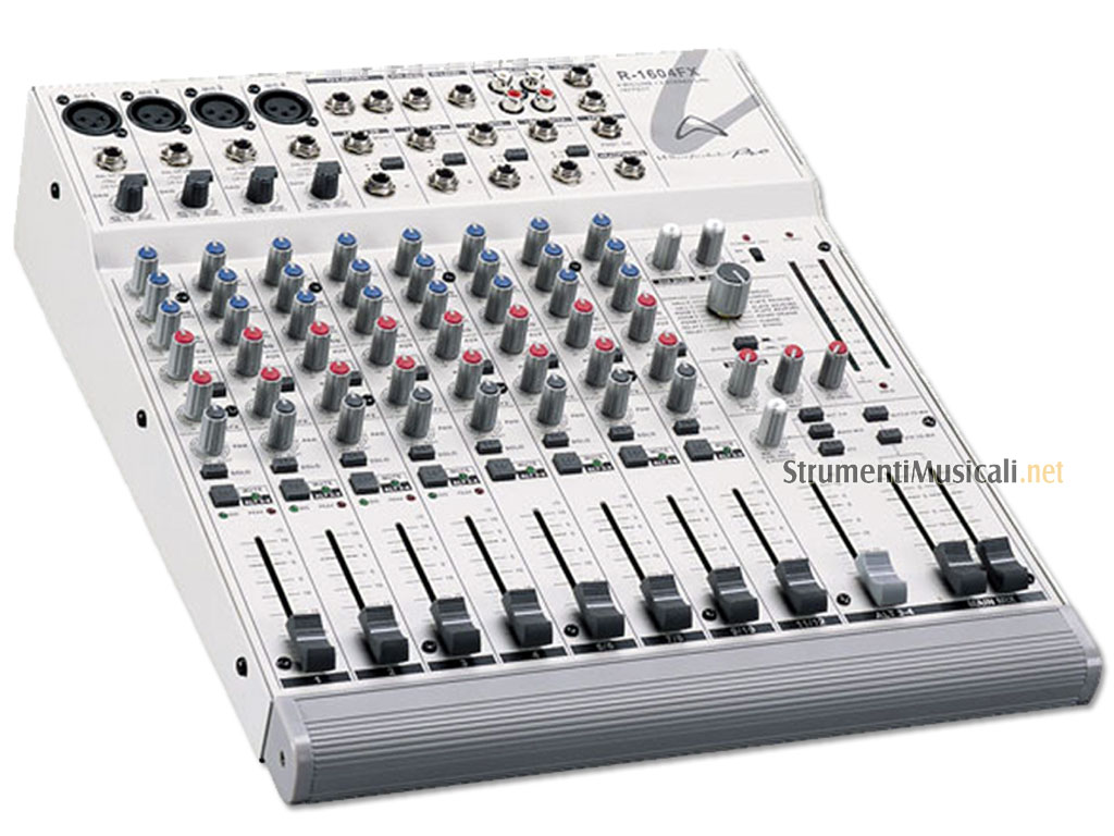 Il R1604FX offre 4 ingressi mic/line mono, bilanciati e quattro canali di ingresso stereo con 3 bande di equalizzazione su ogni canale.
