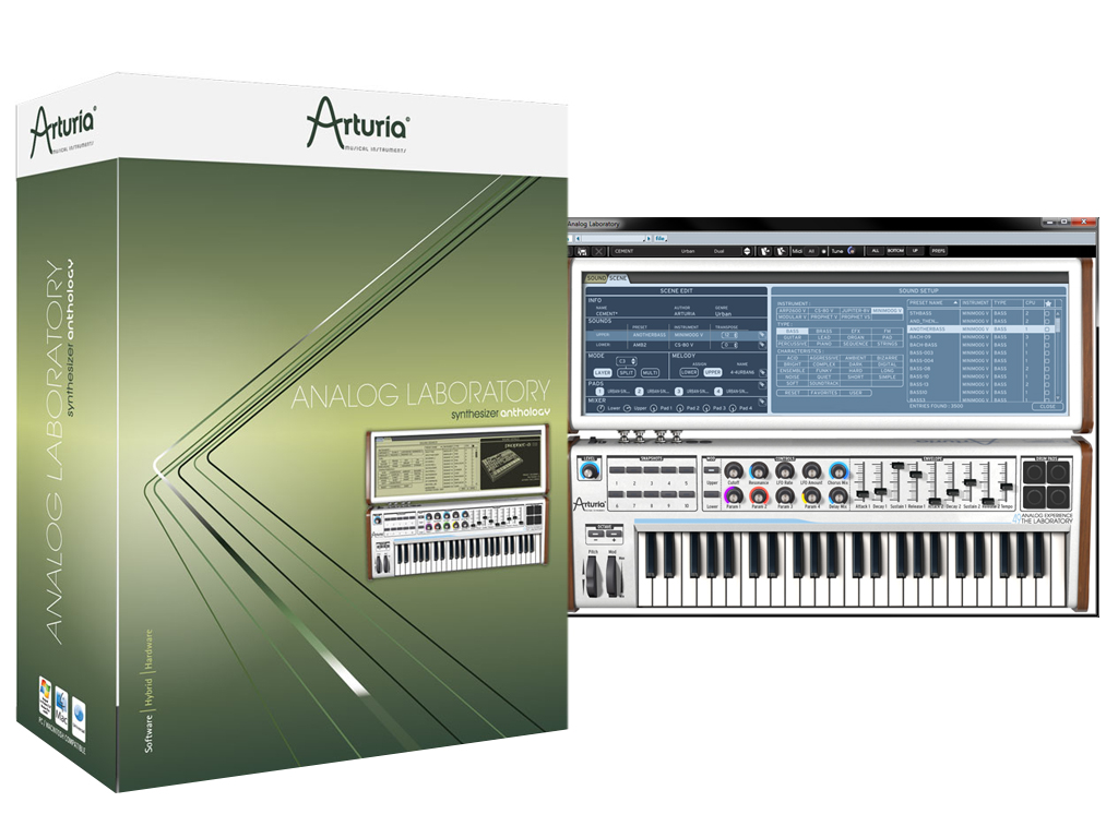 Analog Laboratory è il nuovo potente sintetizzatore di Arturia: 3500 suoni di sintetizzatori leggendari che possono essere modificati liberamente tramite un'interfaccia semplice ed intuitiva, 200 scene suddivise per genere, compresi loop di batteria e complesse melodie per gli arpeggiatori, sono destinati a rendere Analog Laboratory la workstation di riferimento per i suoni di sintetizzatore. Con una selezione di 3500 suoni degli Arturia Classic Synths (minimoog-V, Moog modular V, CS-80V, Prophet-V, ARP2600 V e Jupiter-8V), Analog Laboratory consente di aprire qualsiasi altro synth Arturia per modificare le patch in maniera approfondita in una finestra a parte. E' anche possibile assegnare uno dei 4 parametri principali del Laboratory ad un controllo a scelta all'interno del sintetizzatore software preferito. La Modalità Scene consente di combinare 2 suoni di sintetizzatore su una tastiera MIDI in configurazione split, layer o multi; assegnare frasi melodiche avanzate basate su arpeggi usando la libreria di 200 melodie organizzata per generi e usare i pad per lanciare i loop ritmici contenuti nella libreria di 350 file REX.