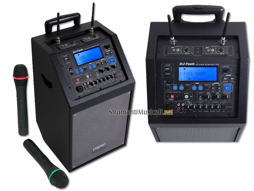 Quando avete bisogno di portare la musica con voi, ovunque voi siate, uCube station V2 è il vostro compagno ideale! Con 2 microfoni UHF a frequenza sezionabile e un lettore Mp3 integrato con un grande display, non avrete davvero più bisogno di niente. Mai più cd grazie alle entrate Usb o per Sd Card che vi permettono di portarvi dietro migliaia di canzoni senza ingombri. Ucube Station v2 è la soluzione ideale per Palestre, conferenze, feste, saggi di danza, karaoke e per qualsiasi evento desideriate fare. Costruito con materiali resistenti ed altamente professionali permette un'agile e completa soluzione in totale mobilità.