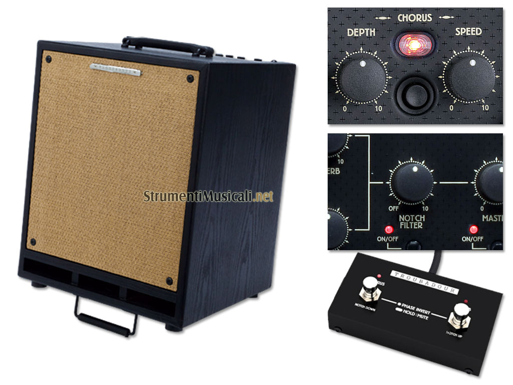 Tutti gli amplificatori Troubadour includono un effetto chorus per la produzione di tonalità naturali, mentre il T35 T80 e T20 includono anche un effetto di riverbero per una più ampia varietà di opzioni di suono. Il T80 dispone anche di un preamp DSP-based per i suoni più puliti ed una più alta qualità del suono.