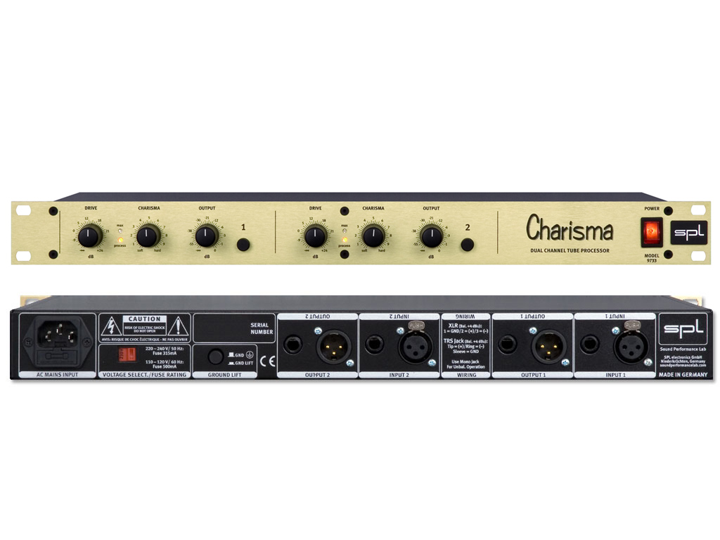 CHARISMA è un processore valvolare a 2 canali progettato per migliorare la potenza, il punch, la dinamica e le sonorità soggettiva del segnale da processare. Progettato per introdurre calore e una soggettività tonale al materiale registrato digitalmente, Charisma è stato sviluppato congiuntamente da SPL e Manfred Reckmeyer, il progettista responsabile dello sviluppo del Charisma a 8 canali. Charisma rappresenta una soluzione che supera di gran lunga la semplice simulazione di una saturazione del nastro: le caratteristiche della saturazione valvolare del Charisma possono essere completamente controllati dall'utente. Il concetto di funzionamento è semplice. Ogni canale Charisma ha tre potenziometri: DRIVE imposta il livello di saturazione delle valvole, il Charisma regola la caratteristica della saturazione della valvola, e OUTPUT imposta il livello di uscita del segnale.