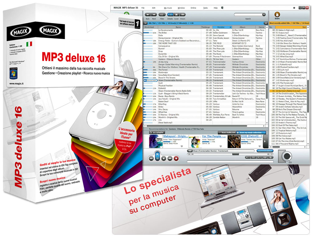 MAGIX MP3 deluxe 16 è lo strumento perfetto per la tua raccolta musicale digitale. Il programma offre tutte le funzioni che cerchi in un'unica soluzione. Importare CD, gestire la raccolta musicale, registrare nuove canzoni da Internet non è mai stato così facile! In più trasferisci tutto comodamente sul tuo lettore MP3, iPod™ o cellulare. Organizzazione perfetta! Hai tutto sotto controllo: da una rapida riorganizzazione della raccolta musicale o una semplice operazione per rinominare singoli brani, fino alla creazione di playlist personali e alla masterizzazione di CD con le tue hit preferite.