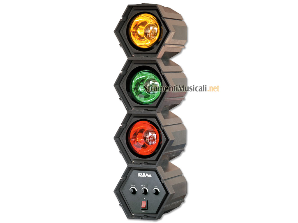 KARMA DJ 318D è ideale per usi domestici, è formato da tre proiettori con lampade colorate da 60W collegati ad un modulatore con microfono incorporato che effettua una rotazione luminosa regolabile sia in sensibilità che in velocità. Tasto di accensione frontale.