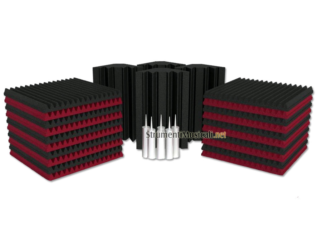 Kit di pannelli per il trattamento acustico degli ambienti realizzati in schiuma di poliestere alto coefficiente di assorbimento acistico, additivato con ritardante al fuoco, progettati seguendo elevati standard tecnici. Include: 20 pannelli corrugati di dimensioni 600 x 600 x 50 mm, 4 bass traps da 600 mm, 6 confezioni di fluido adesivo e guida all'istallazione dei pannelli.