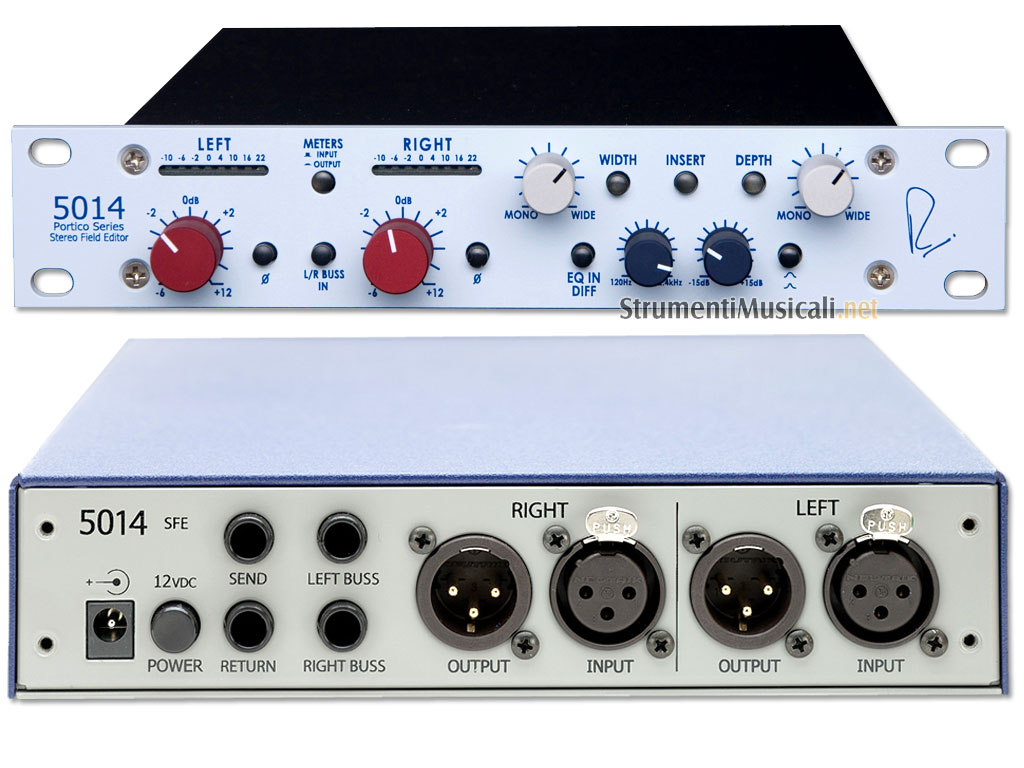 Portico 5014 è un editor di campo stereo. Permette la localizzazione e la definizione della profondita' stereo permettedo una creativitra' senza limiti grazie anche all'opzione "Difference". 2 In e 2 Out TRS bilanciati, connessione Portico Bussing System per usare altri segnali provenienti dalla serie Portico e send/return indipendente per il canale "Difference". Disponibile in versione verticale su richiesta.