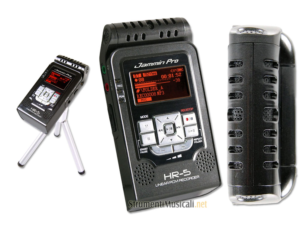 JamminPro HR5 è un registratore digitale stereo portatile e ultracompatto adatto a registrazioni vocali o musicali di qualità. E' dotato di una memoria interna HDD da 2GB, capace ci contenere più di 35 ore di registrazione e supporta card SD/SDHC ad alta capicità. E' possibile registrare con risoluzione a 24-bit ed un ampia gamma dinamica ( frequenze di campionamento fino a 96 Khz ) che garantiscono una definizione più che doppia rispetto a quella ottenibile con un CD Audio. HR5 monta un doppio microfono a condensatore per l'effetto stereo e un piccolo speaker stereo ottimizzato per monitorare le proprie registrazioni. Completano il prodotto funzioni come Auto Gain Control ( in presenza di volume troppo basso ne viene innalzato il livello automaticamente ), indicatori di livello e di picco e la funzione VOX (Voice Activated Recording) che fa attivare il registratore al verificarsi di un evento sonoro superiore a una soglia prefissata.