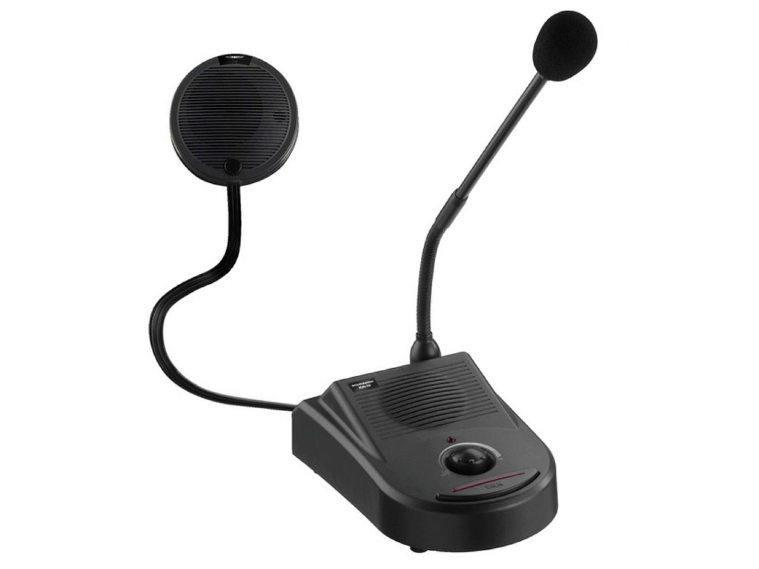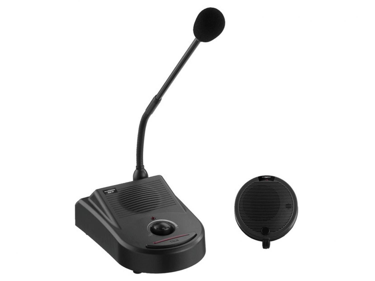 L'interfono a cavo ICM-20 è adatto ad esempio, per reception, sportelli di vendita, ristoranti, etc. E' composto da una stazione base con amplificatore integrato, da una stazione di chiamata e da un alimentatore a spina. Il materiale di montaggio per fissare la stazione di chiamata è fornito in dotazione. La stazione base dispone di un altoparlante integrato con regolazione del volume, di un microfono staccabile a collo d'oca e di un tasto voce. La stazione di chiamata, con altoparlante integrato e microfono viene collegata con la stazione base per mezzo di tre cavi. In più possiede un tasto voce per far scattare un suono segnaletico.