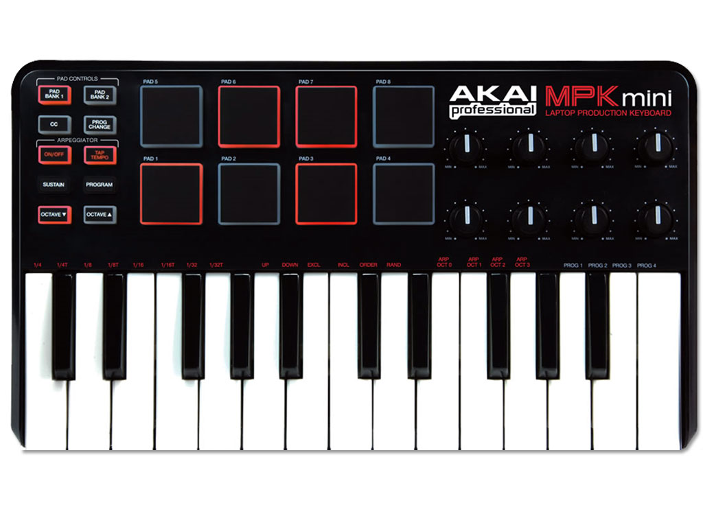 L'Akai Pro MPK mini è una tastiera mini USB MIDI, super compatta, con numerosi pulsanti, potenziometri e pad che ti mettono a portata di mano i parametri dei tuoi software di produzione musicale in studio e dal vivo. MPK mini è la perfetta fusione tra trasportabilità e funzionalità, dato che miscela la comodità di trasporto della serie di mini controller LP alle numerosi funzioni e potenzialità della famosa serie di Master Keyboard da studio MPK della AKAI. MPK mini concentra una mini tastiera a due ottave (25 note), 8 pad retro-illuminati stile MPC e 8 potenziometri rotativi. Ideale quindi per registrare note e frasi musicali nel sequencer grazie alla tastiera sensibile alla dinamica e alla possibilità di estendere il range di note controllate usufruendo dei tasti per la trasposizione delle ottave (Up, Down). Anche nella MPK mini abbiamo un arpeggiatore integrato, da sempre un punto di forza della seria MPK rispetto ai prodotti concorrenti. Grazie al tasto Tap-Tempo potremo sincronizzare l'arpeggiatore alla velocità in BPM del brano sul quale vogliamo suonare. Presente anche un tasto Sustain, che simula in pieno la funzione di solito attribuita ad un pedale.