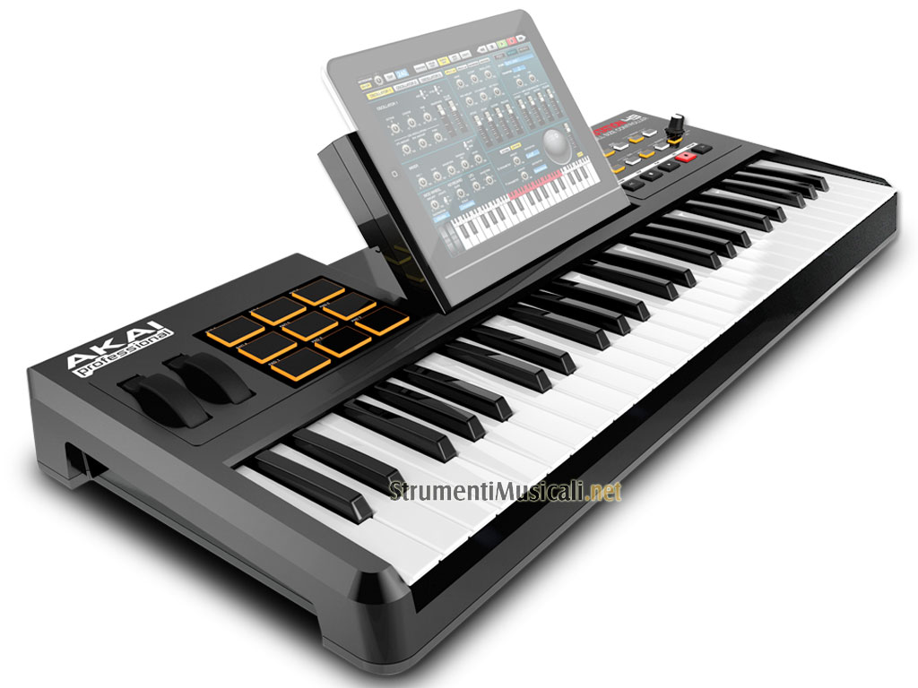 SynthStation 49 è la tastiera/controller 49 tasti più avanzata progettata appositamente per l'uso con iPad. SynthStation 49 è studiata per interagire alla perfezione e sfruttare tutte le potenzialità dell'applicazione SynthStation progettata da Akai Professional e disponibile sull'App Store di Apple. Dal controllo delle varie funzioni e parametri alla registrazione MIDI, sfruttando la tastiera sensibile alla dinamica, i 9 pad retroilluminati in stile MPC e un'ampia sezione dedicata al trasporto (play, stop, record, ecc.). Il dock consente di posizionare stabilmente l'iPad, in più il dock funge da alimentatore per l'iPad e le due uscite Jack TRS (bilanciate) da ¼" ti permetteranno di collegare al tuo impianto audio il segnale generato dall'iPad riprodotto dalle applicazioni mediante la tastiera. SynthStation 49 è inoltre utilizzabile come MIDI Controller per i software installati sul tuo computer Mac o PC grazie alla connessione USB. La tastiera dispone delle classiche ruote per il controllo del pitch bend e della modulation. I 9 pad possono essere utilizzati per suonare drum kit o samples, come gli oltre 50 kit di batteria disponibili nell'applicazione SynthStation by AKAI (non inclusa, acquistabile nell'Apple Store).