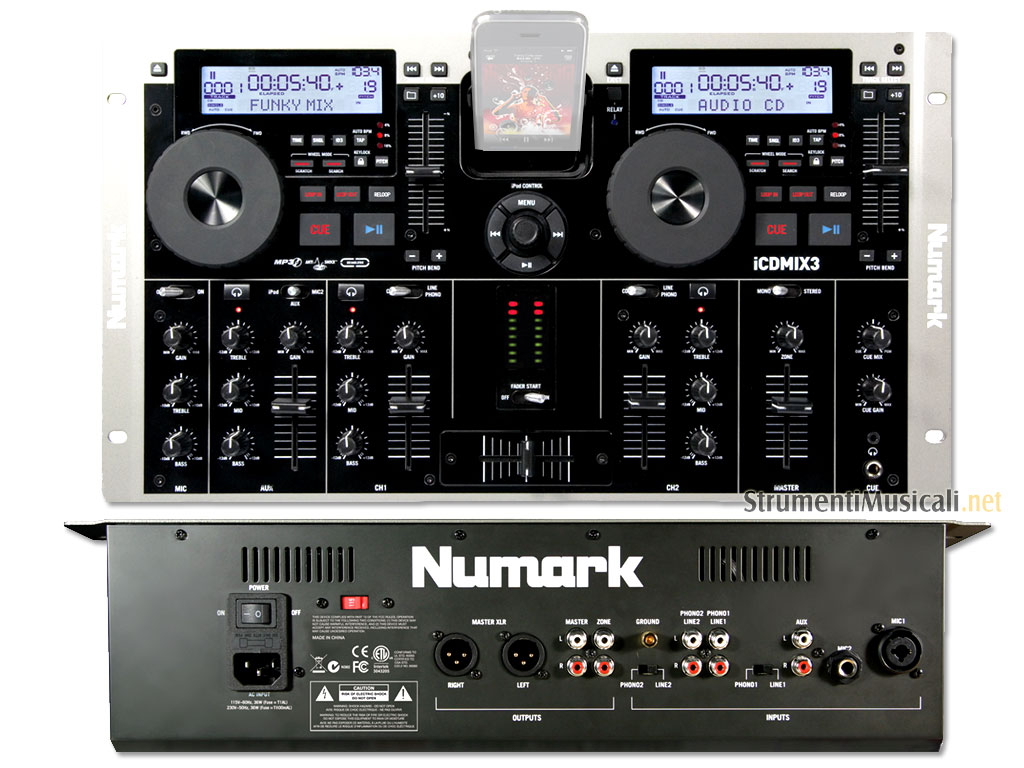 Numark iCDMIX 3 è un DJ Set costituito da un doppio lettore CD e un mixer in una unità mobile di lavoro facile da trasportare per DJ, per locali che devono essere in grado di riporre il proprio sistema in modo rapido e qualsiasi altro DJ in movimento. Setup e smontaggio sono veloci e facili con i sistemi iCDMIX, perché non c'è bisogno di spendere così tanto tempo a disporre i cavi e testare i livelli come nei componenti tradizionali. iCDMIX3 è il primo CDMIX con Universal Dock integrato per iPod, che consente di riprodurre musica da qualsiasi iPod.