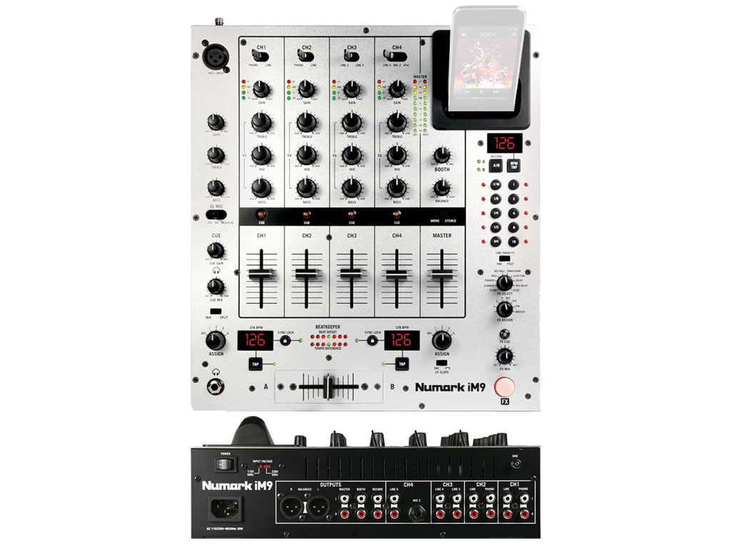 iM9 è il nuovo mixer 4 canali con effetti e dock ipod/iphone di casa Numark. Con l'iM9 potrai mixare qualsiasi sorgente sonora: dai giradischi ai lettori CD, dai microfoni all'iPod, drum machine, sintetizzatori, campionatori e qualsiasi altra sorgente line. iM9 dispone della tecnologia BeatKeeper che consente il calcolo automatico dei BPM di una sorgente audio, per sincronizzare gli effetti alla velocità delle tracce in ingresso. Non un semplice mixer quindi, ma un ricco strumento dotato di un Eq 3 bande, preascolto e gain indipendenti su ciascun canale, e di un multi-effetto integrato capace di operare in pre e post fader, dotato di numerosi effetti, molti dei quali modulabili da un LFO sincronizzato ai BPM e adattabile a varie divisioni metriche mediante una sezione di pulsanti dedicati. In più, nell'iM9 è disponibile un canale microfonico indipendente con eq 2 bande e guadagno. Il dock iPod consente di registrare direttamente sui device di casa Apple le tue performance e di riprodurre le tracce in essi memorizzate. Tra gli effetti disponibili troviamo delay, filtri, flanger, roll, riverbero, trasform, pan ed eco.