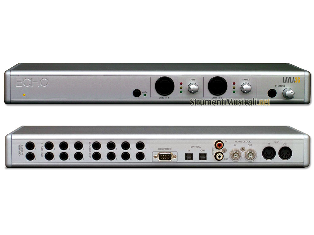 Echo Layla3G è una scheda audio PCI con rack esterno che permette di avere 2 ingressi "Autosensing" con pre microfonici e alimentazione phantom, e altri 6 In e 8 Out analogici 24/96, I/O SPDIF, ADAT per un totale di 16 ingressi e ben 16 uscite, MIDI, uscita cuffia con volume separato e DSP per Mixing digitale con monitoring Zero Latenza.