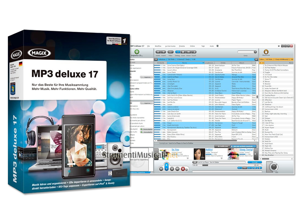 MAGIX MP3 deluxe 17 è il programma perfetto per gestire la tua raccolta di musica digitale in MP3. Scopri tante nuove funzioni, ed una flessibilità unica: ordina le tue canzoni in base alla sonorità, agli artisti o agli album per una ricerca più veloce, crea playlist automatiche in un click o correggi titoli di brani errati o aggiungi quelli mancanti. Con MAGIX MP3 deluxe 17 avrai a disposizione le migliori funzioni per trovare nuova musica, come ad esempio consigli musicali, web radio, Hit Finder automatico, music browser con funzione download diretta, universo musicale in 3D.