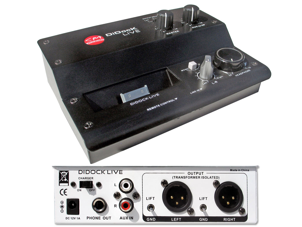 Avete ora la possibilità di mixare segnali audio esterni con quello del vostro iPod! Inserite una traccia da utilizzare per le performance dal vivo, mixate il segnale proveniente dal vostro sistema di monitoraggio, combina l'uscita mixer con le tracce MP3. I controlli posti sul pannello frontale consentono di creare in modo rapido master-mix e mix per monitor/cuffie in maniera indipendente. Il batterista sta suonando con l'ausilio di una click-track? Il pubblico non se ne accorgerà mai! Il DIDock Live dispone di uscite XLR bilanciate, selettore output Left/Centre/Right, della modalità di "ricarica" in modo che il vostro iPod sia sempre pronto all'uso e un ingresso per il controllo remoto dell'iPod.