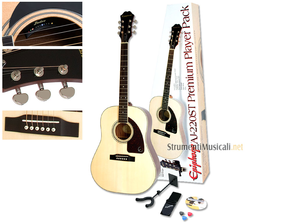 • Il kit include: Chitarra AJ-220ST con accordatore incorporato, gancio a parete in metallo (incluso hardware di montaggio), DVD didattico di MJS Pubblicazioni, tracolla Epiphone, tre plettri Epiphone