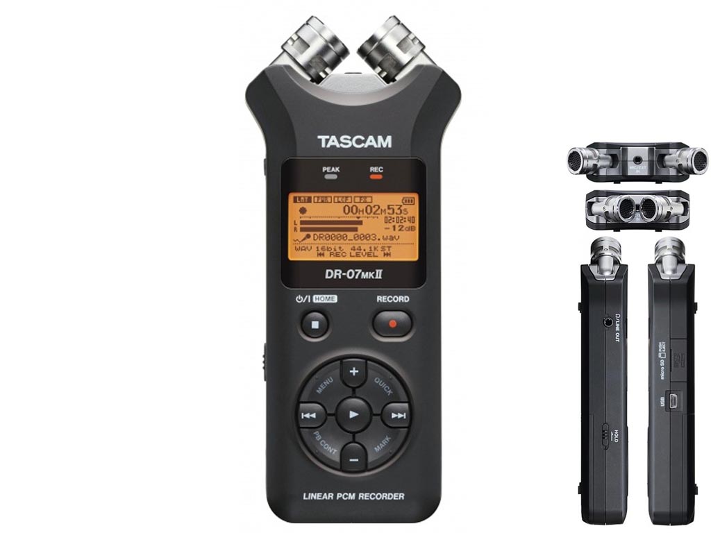 Il DR-07MKII costituisce la versione avanzata dell'assai popolare e facile da utilizzare registratore palmare DR-07 che, tra l'altro, si è rivelato uno dei best seller di Tascam. Il nuovo portatile prevede due microfoni a condensatore, stereo, orientabili, in grado di reggere grandi pressioni sonore, con diagramma di cattura cardioide. Possono essere orientati in configurazione a "XY" per realizzare registrazioni compatibili in mono, con grande localizzazione del suono (riducendo differenze di fase tra i due canali), ma anche in configurazione "AB" per realizzare un setup in grado di ricreare una scena sonora molto ampia. Il registratore portatile palmare stereo Tascam DR-07MKII è in grado di catturare audio molto qualitativo a risoluzione fino a 96 kHz/24 bit e memorizzare le registrazioni su supporti media a stato solido quali microSD o microSDHC. Il DR-07MKII integra tutte le caratteristiche di eccellenza dei predecessori firmati Tascam, ed è facile da utilizzare, basta un solo dito.