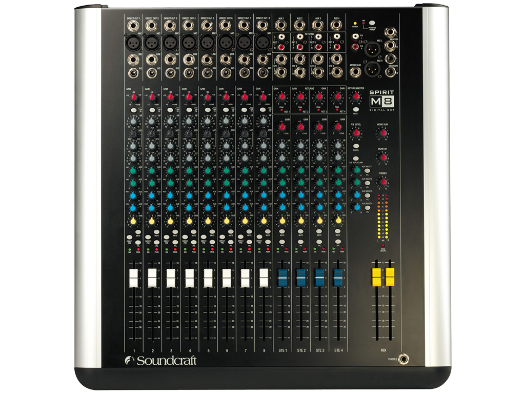 Il Soundcraft M8 è dotato di 8 ingressi mic/linea mono, 4 ritorni stereo e 4 ingressi di linea stereo. I preamplificatori microfonici sono basati sulla tecnologia impiegata nei modelli B 800 e Ghost; la sezione di equalizzazione è particolarmente accurata, i fader a corsa lunga garantiscono assolvenze e dissolvenze senza imprecisioni ed una nutrita serie di uscite, compresa la S/PDIF digitale, soddisfano ogni tipo di esigenza. Costruzione estremamente robusta e prestazioni audio ineguagliabili per la loro categoria li rendono adatti a situazioni di ogni genere, dal musicista a cui servono numerosi ingressi stereo per tastiere, campionatori ed expander, all' home studio dove è importante disporre di preamplificatori e filtri di qualità nonché dei ritorni stereo e dell'uscita digitale, alle applicazioni live dove è necessario avere flessibilità, affidabilità ed un buon suono. L'uscita cuffie è stata posizionata in basso a destra per una maggiore praticità, la nuova sezione di alimentazione è a bordo del mixer e dissipa il calore senza surriscaldarne la circuiteria. Nei modelli M8 ed M12, nascoste sotto i profili laterali di alluminio, sono integrate le alette per il montaggio a rack (11unità da 19"), che conferiscono una maggiore robustezza e rigidità rispetto ai comuni sistemi kit da applicare esternamente.