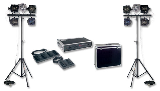 • 2 Barre fari precablate composte da: 8 fari par56, 8 parabole in alluminio, 2 luci strobo 75W, 8 portagelatine con gelatine gialla, rossa, verde e blu