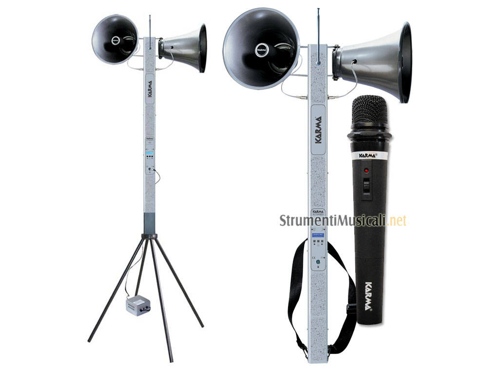 • Accessori in dotazione: Basamento, Antenna estensibile, Alimentatore carica batterie, Viti di fissaggio trombe, Cinghia di trasporto, 1 radiomicrofono, Manuale d'uso