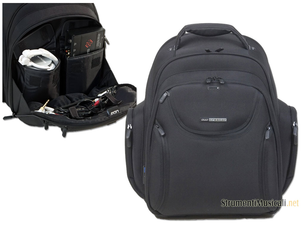 Zaino semirigido ed imbottito in grado di contenere laptop fino a 15.4" + 1 controller tipo Vestax VCI 300 o Hercules 4MX o un battle mixer tipo Rane TTL 57 SL + dischi in vinile + schede audio + cuffia + accessori.