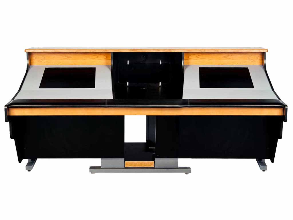 Console compatta e versatile con due gruppi rack da 8 unità ciascuno. Strutturalmente simile alla linea Geo con finiture e forma diverse. Costruita su 3 piedi in ferro con una struttura in multistrato di betulla e superficie antigraffio. I piani sono in legno massello, i ripiani in D-bond di colore grigio. Prevede 2 spazi rack da 8 unità e la slitta per PC/ MAC. Comodo accesso all'area dei cablaggi con passacavo comunicanti e chiusure posteriori a sgancio rapido.