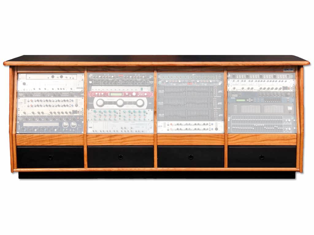Mobile rack da studio professionale strutturato per ospitare da 4 gruppi di rack da 10 unità, realizzato interamente in multistrato di Betulla e massello di Frassino.