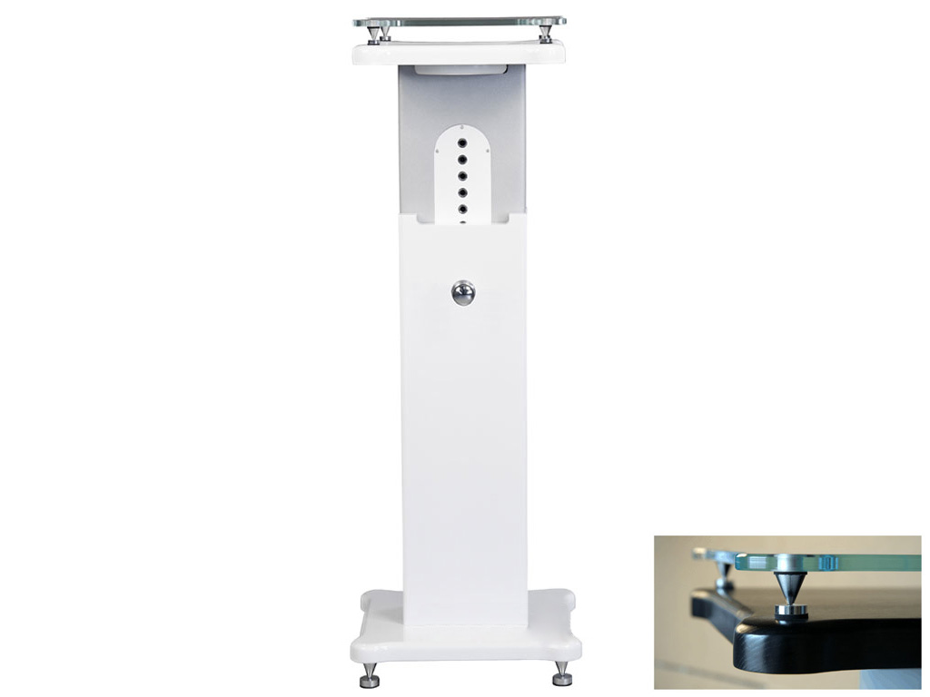 Solido Stand per Monitor da studio e hi-end realizzato in legno massello. Regolabile in altezza a step fissi con sistema di Isoglass su puntali in acciaio, tali da limitare la trasmissione delle basse frequenze.
