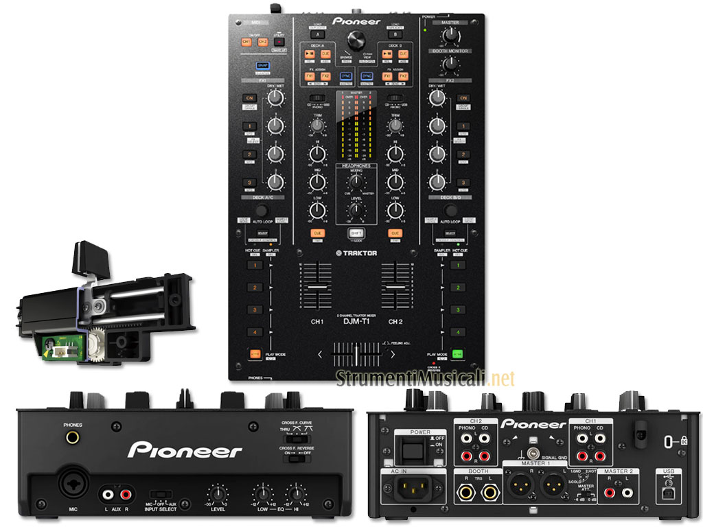 Pioneer DJM-T1 offre una soluzione completa: mixer, controller e interfaccia audio in un'unica unità. Nella confezione è inclusa anche una copia del software TRAKTOR SCRATCH DUO 2, insieme ai controlli cd e vinile necessari per il DVS scratch control. Tutto quello che bisogna fare sarà connettere i propri lettori CDJ o i piatti al mixer e il software farà il resto. Accanto ai due scratch deck, i DJ possono lavorare su un paio di Sample Deck e caricare su ognuno fino a quattro loop o campionature – per incredibili loop e remix. Pioneer DJM-T1 è attrezzato per utilizzare i controlli con la punta delle dita. Una serie di controlli sono dedicati per gli effetti Advance e Chained di TRAKTOR, mentre altri sei sono offerti dal software in dotazione. I DJ scratcher saranno felici nel vedere gli adeguamenti essenziali come lag, tensione, curva e funzioni di inversione. L'interfaccia audio integrata a l'interfaccia MIDI consente ai DJ di connettersi con il computer tramite un cavo USB ed è stata aggiunta un'apposita uscita per registare facilmente sul mixer le evoluzioni più creative.