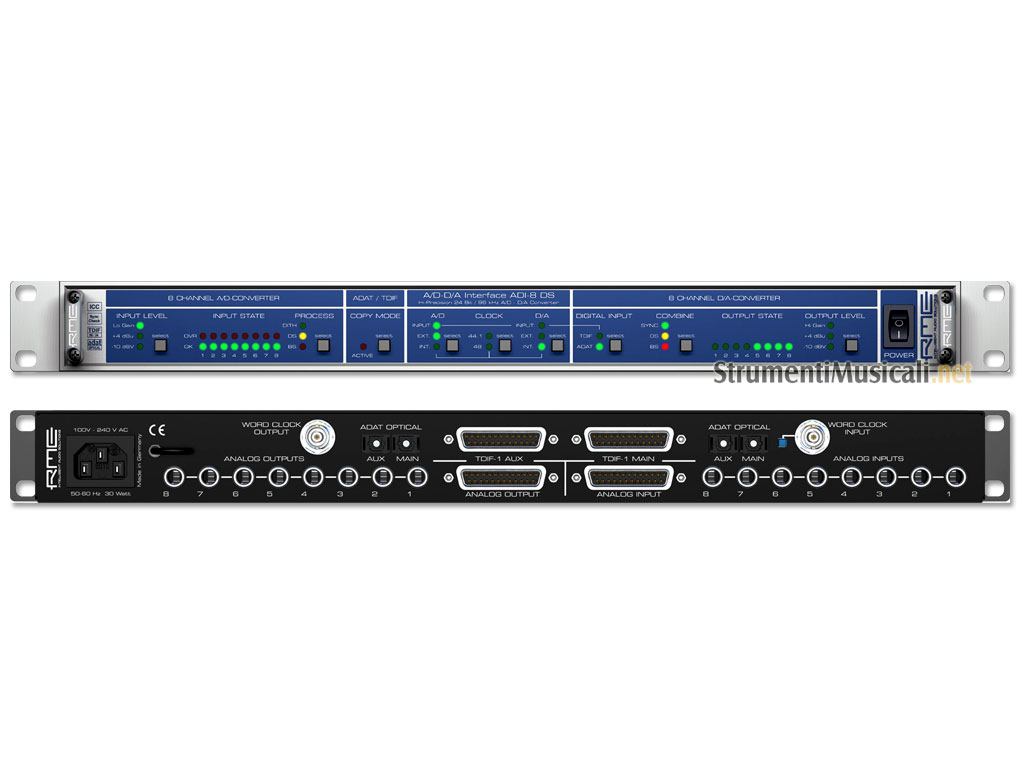 DS è l'acronimo di Double Speed, cioè Sample Rate doppia. Poiché l'ADAT ottica non supporta frequenze superiori a 48kHz, la modalità DS ha bisogno di due canali per trasmettere i dati di un solo canale. Il metodo usato chiamato Sample Split è compatibile con l'S/MUX ed è supportato da tutte le Hammerfall. La combinazione di una scheda come la Hammerfall con questo convertitore consente la compatibilità con i sistemi DVD fornendo un sistema di registrazione Hi-End ad un prezzo favoloso. L'ADI-8 DS è praticamente identico all'ADI-8 Pro tranne che per il supporto delle frequenze di campionamento 88.2 e 96 Khz, per il Dithering e per il salvataggio automatico di tutti i settaggi.