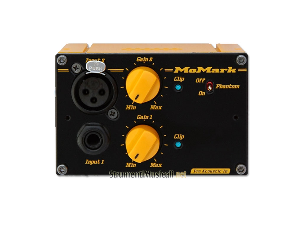 Questo modulo preamplificatore è stato appositamente creato per gli strumenti acustici. È dotato di due canali di preamplificazione a stato solido, con un ingresso jack 1/4" per il canale 1, e un ingresso XLR per il canale 2; è stato progettato per i pickup ed i sistemi microfonici più utilizzati dai contrabbassisti e dai bassisti acustici. L'alimentazione phantom 48V commutabile sul canale 2 consente di utilizzare microfoni a condensatore e altri dispositivi che richiedono l' alimentazione phantom. Grazie a questo modulo preamplificatore, gli utenti MoMark possono trasformare la loro testata in un amplificatore dedicato per strumenti acustici.