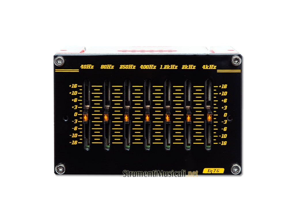 Il modulo Eq7G dispone di sette bande di equalizzazione grafica fissate a 40 Hz, 80 Hz, 250 Hz, 400 Hz, 1 kHz, 2 kHz e 4 kHz. Illuminato da LED gialli, questo EQ grafico consente di "vedere" la modellazione del tuo suono su qualsiasi palco al buio.