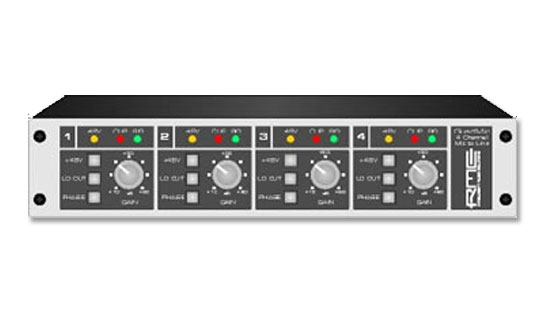 QuadMic offre 4 ingressi microfonici bilanciati su XLR. Ciascun canale ha un selettore per l'alimentazione 48V phantom, un filtro low cut e inversione di fase. L'amplificazione può essere impostata tra 10 e 60 dB. I LED per il segnale, clip e attivazione dell'alimentazione phantom completano la lista delle caratteristiche. Le uscite bilanciate di linea si trovano sul retro dell'unità con jack stereo TRS. Il livello di uscita di riferimento è selezionabile tra +4 dBu o -10 dBV. Le alette universali per rackmount della RME si possono usare per inserire il QuadMic in qualsiasi rack a 19". L'alimentatore professionale fornito con la macchina consente di utilizzarla tranquillamente in ogni situazione, anche quando l'alimentazione è debole o rumorosa.