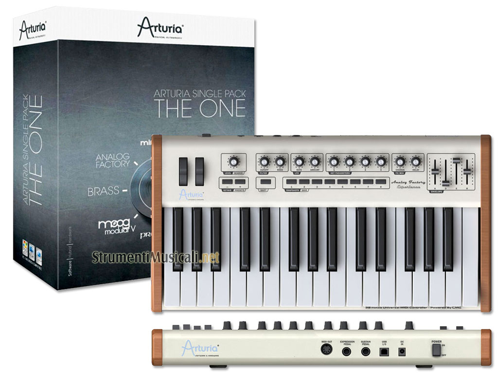Questo bundle è composto dal synth Analog Factory Experience e dal software The One che contiene tutti gli strumenti Arturia. Analog Factory Experience 32 è il primo "sintetizzatore ibrido" realizzato da Arturia che è riuscita ad unire al meglio hardware e software fornendo in un'unica soluzione un'applicazione software nativa e una tastiera controller dedicata. Avendo come ottimo punto di partenza il 'pluripremiato' Analog Factory 2.0, lo strumento virtuale Arturia con in dotazione 3500 suoni di tutti i principali sintetizzatori degli ultimi decenni, Analog Factory Experience espande il concetto del software e integra anche una una tastiera dedicata a 32 tasti con velocity di ottima fattura. The One in un unica confezione contiene tutti gli strumenti Arturia e una licenza per attivarne uno a scelta: potete installare e provare tutti gli strumenti senza alcuna limitazione per 15 giorni per scegliere alla fine del periodo quale volete autorizzare e continuare ad usare al termine della demo: Moog Modular V, CS-80V, ARP2600 V, Minimoog-V, Prophet V, Jupiter-8V, Brass 2.0 e Analog Factory. Il costo del pacchetto equivale a quello di una licenza Arturia