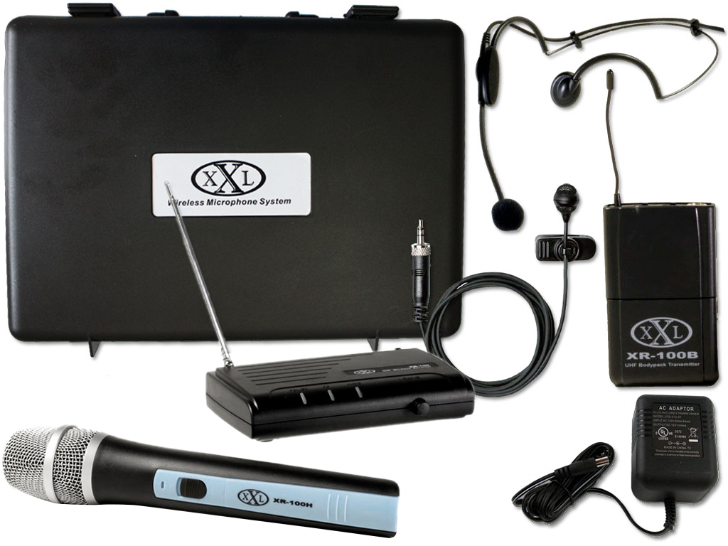 XR100 Combo è un sistema UHF senza fili costituito da un microfono palmare, un ricevitore, un body pack, un microfono ad archetto XC-35J e un microfono lavalier, il tutto in una comoda valigetta in plastica per il trasporto.