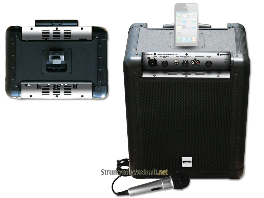 Sound system portatile con diffusore amplificato a 2 vie, sezione di preamplificazione e docking station per iPOD.