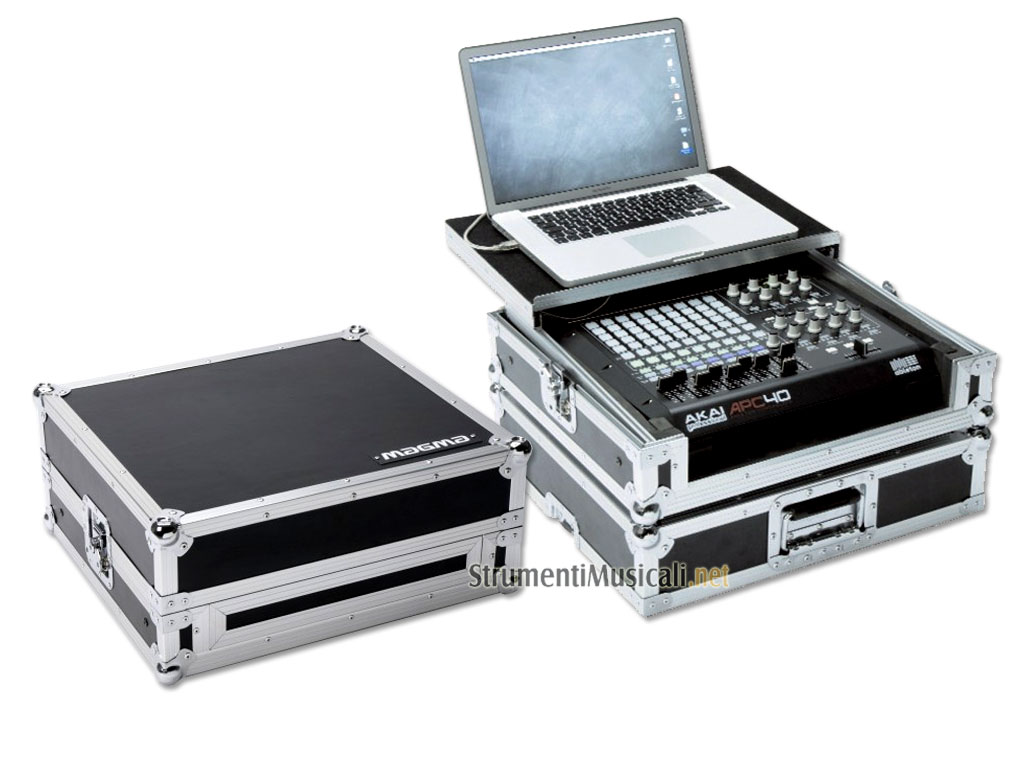 Flight case in grado di contenere un set composto da controller table top tipo Akay APC 40 e laptop fino a 17". Grazie al particolare disegno dello chassis questo modello permette di trasportare il materiale già installato senza rischi durante il trasporto.