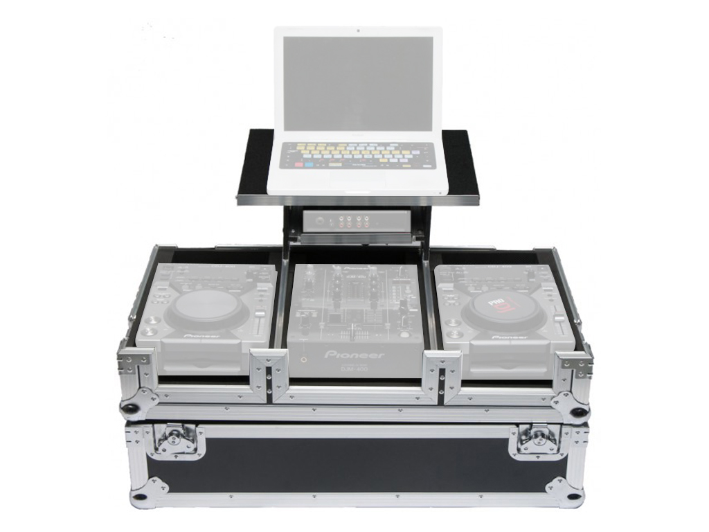 Flight case in grado di contenere un set composto da un mixer Pioneer DJM400(o 350), 2 player CDJ400(o 350) ed un laptop fino a 17". Grazie al particolare disegno dello chassis questo modello permette di trasportare il materiale già installato senza rischi durante il trasporto.