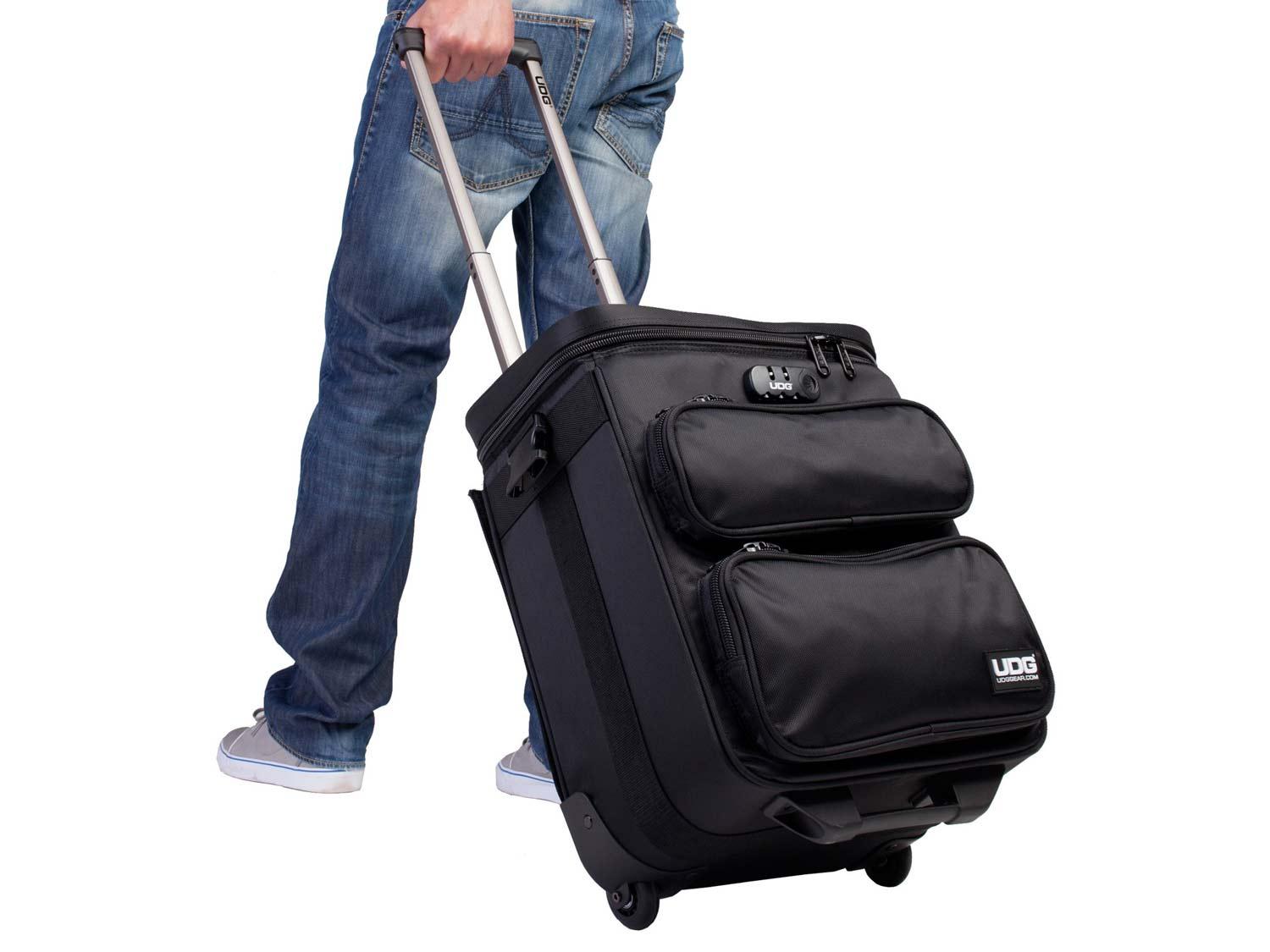 L'UDG DIGI Trolley To Go è costituito da una solida struttura Trolley Bag con ruote in linea ed un manico a due stadi che lo rende ideale per le lunghe passerelle in aeroporto. Costruito per i DJ di frequente in volo, con lo spazio per la tua preziosa attrezzatura da DJ digitale, ha un grande vano centrale, un divisorio estraibile con una sezione organizer per interfaccia audio e cuffie. Una custodia imbottita per laptop che si adatta ad un MacBook Pro 15" viene fornita per proteggere il computer, con due tasche esterne ed una tasca interna a rete adibite per conservare cavi e documenti. Il Digi Trolley To Go è il partner ideale per i viaggi a lunga distanza.