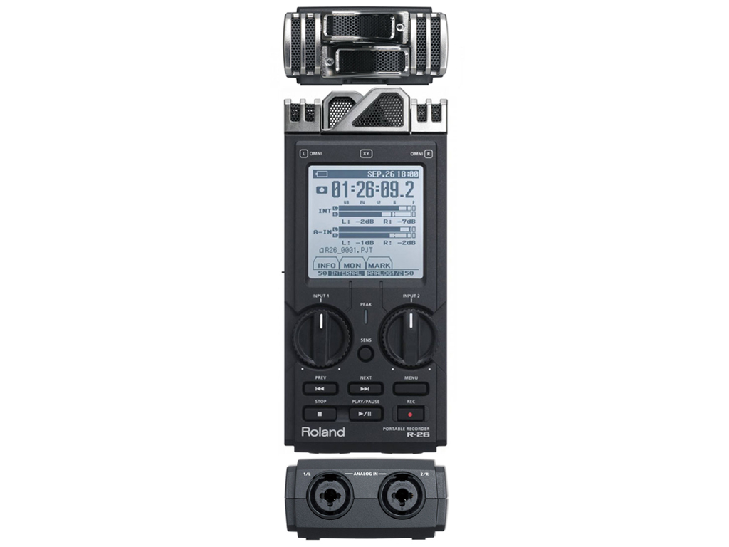 Il Roland R-26 è un registratore innovativo portatile ma tuttavia pieno di caratteristiche professionali prima classe, cose che l'industria non ha mai visto prima. Ci sono due tipi di microfoni stereo incorporati nell' R26, più una coppia di XLR/TRS combo per microfoni esterni ed un ingresso per un microfono stereo. Si possono scegliere combinazioni simultanee dei microfoni incorporati (direzionali e omnidirezionali), così come gli ingressi esterni.