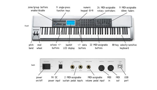 USB e MIDI Master Keyboard professionale con 88 tasti pesati, sensibili alla dinamica (con 9 curve di sensibilità), display retro-illuminato di grandi dimensioni, Pitch Wheel, Modulation Wheel, 9 sliders + 24 controlli rotativi + 22 pulsanti tutti MIDI-assegnabili, 2 ingessi per pedali di Sustain + 1 ingresso per pedale d'espressione tutti MIDI-assegnabili, 10 memorie, tasti ottava +/-, 4 distinte zone di tastiera, invio di ogni tipo di messaggio MIDI (program e control change, bank select, RPN e NRPN, note on/off, MMC, sysex, GM/GS/XG, ecc.), modalità drawbars, connettori USB, MIDI In e MIDI Out (tastiera/computer), alimentazione via USB o con alimentatore esterno opzionale, plug-and-play con supporto nativo per Win XP e Mac OSX (senza uso di driver), driver per Win 98SE, ME, 2000 (SP4), XP (SP1), Mac OS 9.2.2 o superiore (con OMS 2.3.8, incluso) e OSX 10.1.5 o superiore, speciale software di modica parametri e salvataggio memorie.