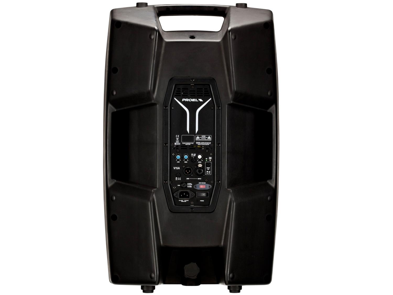 La V15A è dotata di driver da 1" a compressione al neodimio ad alta definizione su tromba ad ampia dispersione (90°x60°) a copertura uniforme, woofer da 15" ad escursione lunga con bobina da 2.5". Il suo amplificatore con potenza di picco di 600W (50W Rms in classe AB per le alte frequenze ed amplificatore in classe D 250W Rms per le basse frequenze) è alloggiato in un box di alluminio. Alimentatore switch mode (SMPS), Mic/Line selezionabile con EQ a 2-bande, processore attivo integrato con doppio Clip limiter per un controllo ed una protezione massima, front LED con selezione On e Signal/Clip. SPL 126dB, risposta in frequenza 45Hz - 20kHz, cabinet in polipropilene con forma asimmetrica per l'uso come monitor da palco, comoda maniglia superiore per una trasportabilità senza sforzi, 4 punti di sospensione M10 per installazione fissa, 18 kg di peso totale.