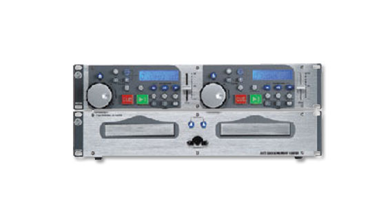 Doppio CD player professionale composto da unità di comando + unità di lettura, montaggio a rack (2+2 U), con display retroilluminati e le usuali funzioni “Disco”, Pitch +/-12%, buffer 40 secondi, alimentazione 230V.