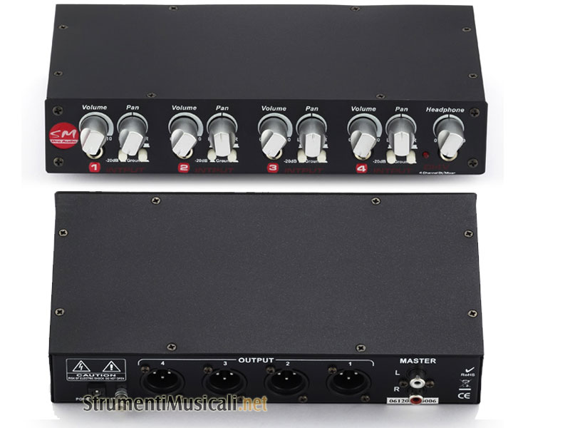 DI box/mixer a 4 canali, ognuno con In jack 1/4" sbilanciato/bilanciato, Out XLR bilanciato, controlli di volume, pan, pad e earth lift, master Out stereo RCA, master volume, Out cuffie jack 1/4", alimentatore esterno incluso, formato rack 1/2 unità.