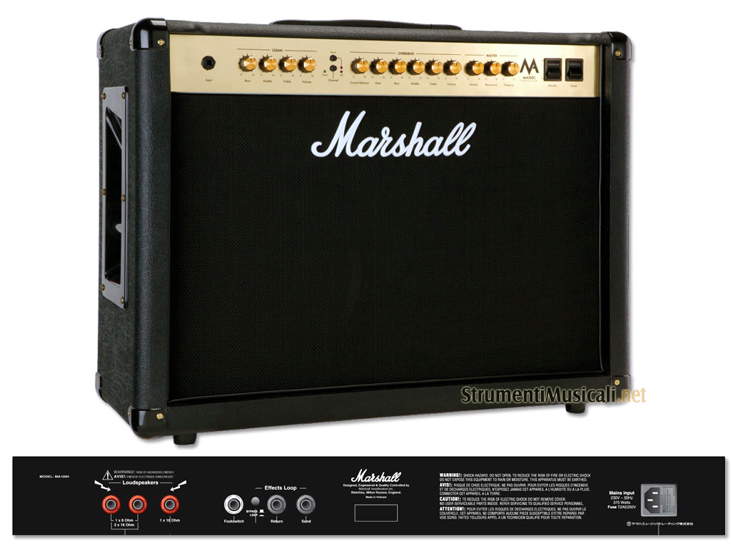 Il MA100C è stato accuratamente progettato dal Marshall Research & Development Team utilizzando gli stessi principi di base di tutti gli amplificatori Marshall, per creare un amplificatore che offra qualcosa di nuovo ed eccitante per tutti. Il Marshall MA100C è in grado di offrire i vantaggi di suone e colore di un amplificatoe interamente valvolare, pur mantenendo un prezzo interessante. Per di più, come ogni Marshall, è costruita per sopravvivere "alla strada". Quindi, così come è la scelta perfetta per il primo amplificatore completamente valvolare, il MA100C è la scelta perfetta per chi vuole portare il proprio sound in tour. La gamma MA offre amplificatori a valvole da Marshall che sono più accessibile che mai. I Marshall MA100C sono alimentati utilizzando le tradizionali valvole Marshall doppio triodo ECC83 nel preamplificatore e pentodo EL34 nel finale di potenza. Il layout e i controlli sono semplici, consente di esplorare senza ostacoli tutto il potenziale della suono "all-valve" di tono all'interno.