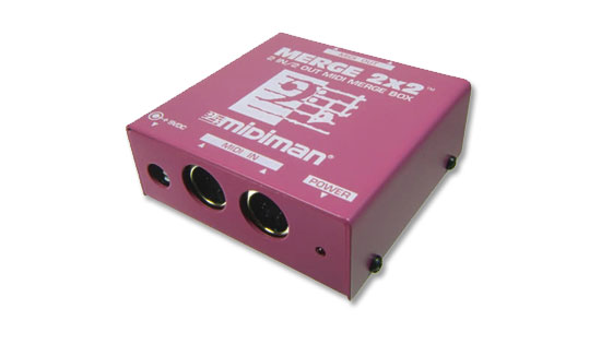 MIDI merge box, con 2 In, 2 Out, invio del messaggio All Note Off all'accensione (funge da panic button), non necessita di alimentazione (viene alimentata attraverso il MIDI In), ingresso per alimentatore opzionale (per particolari casi).